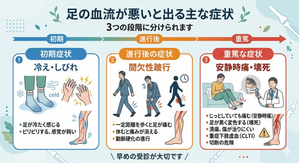 足の血流が悪いと出る主な症状は以下の3つの段階に分けられます。