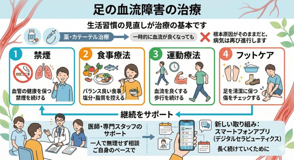 足の血流が悪く、症状が出ている場合は、生活習慣の見直しが治療の基本です。薬やカテーテル治療で一時的に血流が良くなっても、根本的な原因がそのままであれば、病気は再び進行してしまいます。