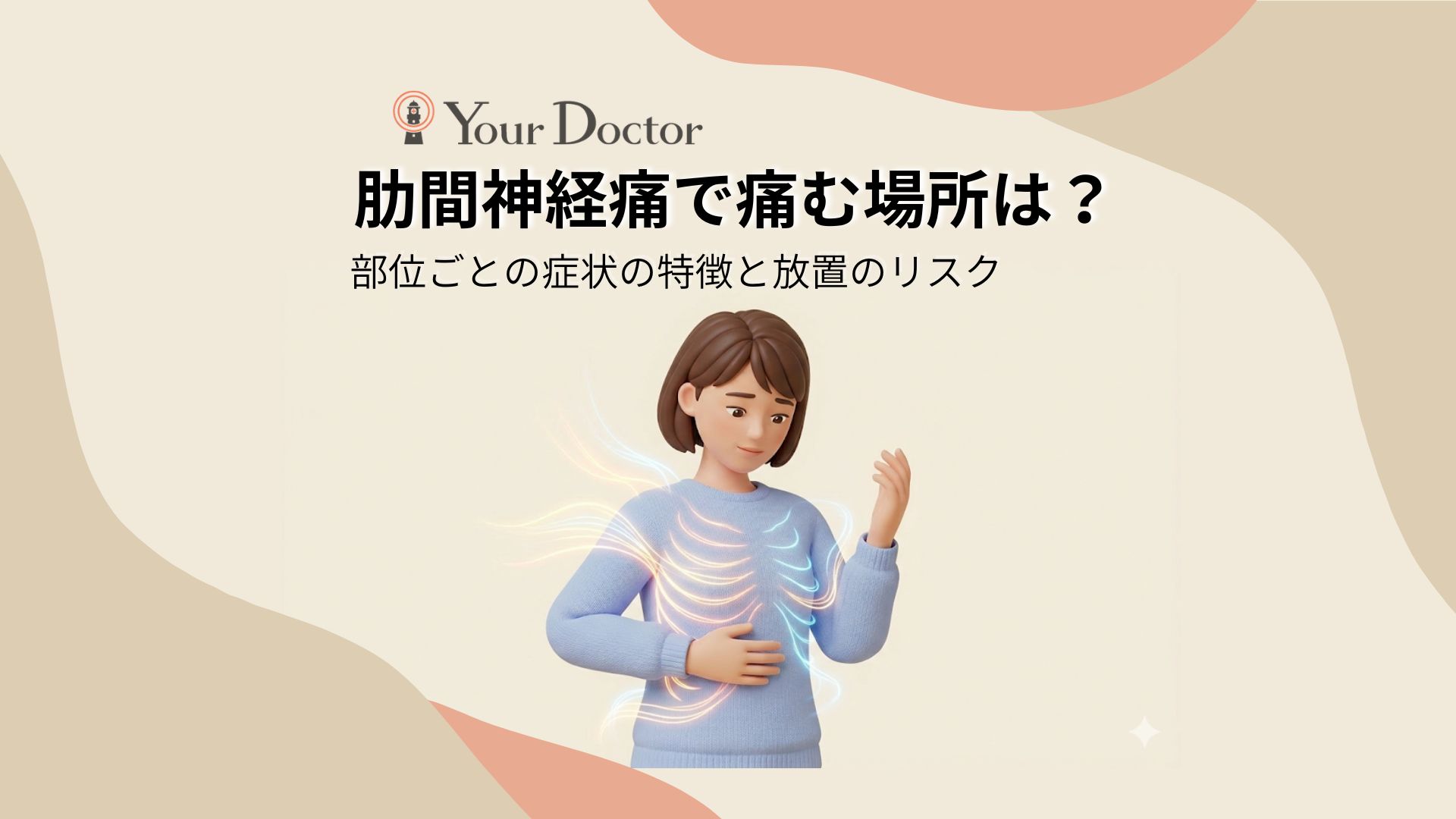 肋間神経痛は、背中や胸、脇腹など肋骨に沿った痛みが特徴です。放置すると慢性化したり、日常生活に支障が出たりするリスクがあります。特に胸の痛みは心臓の病気、脇腹の痛みは帯状疱疹の可能性があるため、自己判断は避けてください。