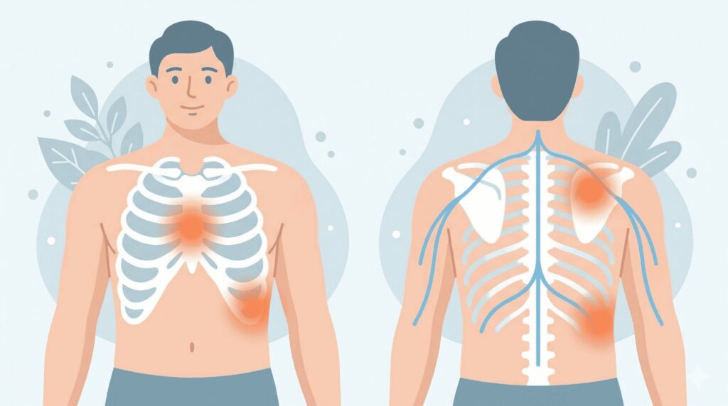 肋間神経痛は、肋骨の間に走る肋間神経が圧迫され、呼吸や体幹の動きにより悪化しやすい特徴があります。特に、咳やくしゃみ、深呼吸などの胸郭が動く動作では、鋭い痛みが走るケースが多くみられます。