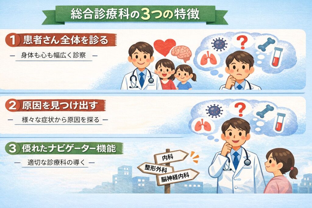 総合診療科とは、「何科に行けばいいかわからない」といったときの最初の相談先になる診療科です。
