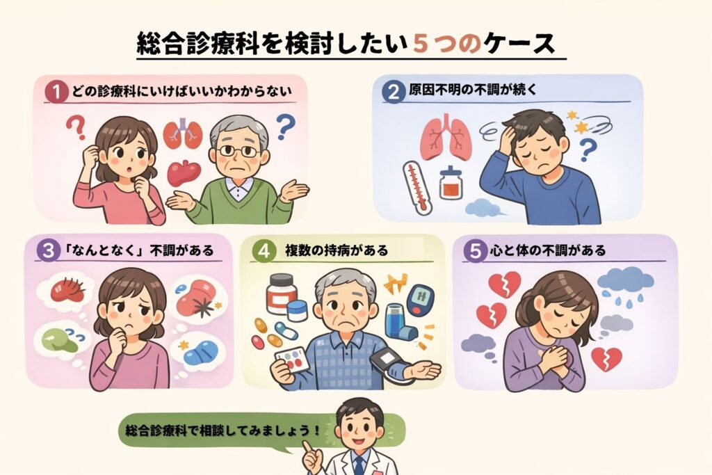 総合診療科の受診を検討すべき5つの代表的なケースを挙げます。