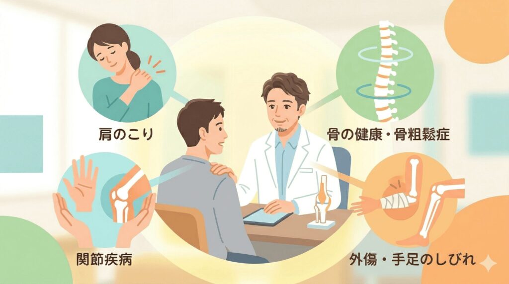 整形外科は、骨や関節、筋肉といった運動器の専門家です。肩こりや腰痛などの身近な悩みから、骨折や椎間板ヘルニアといった専門的な治療が必要な疾患まで、幅広く対応しています。
