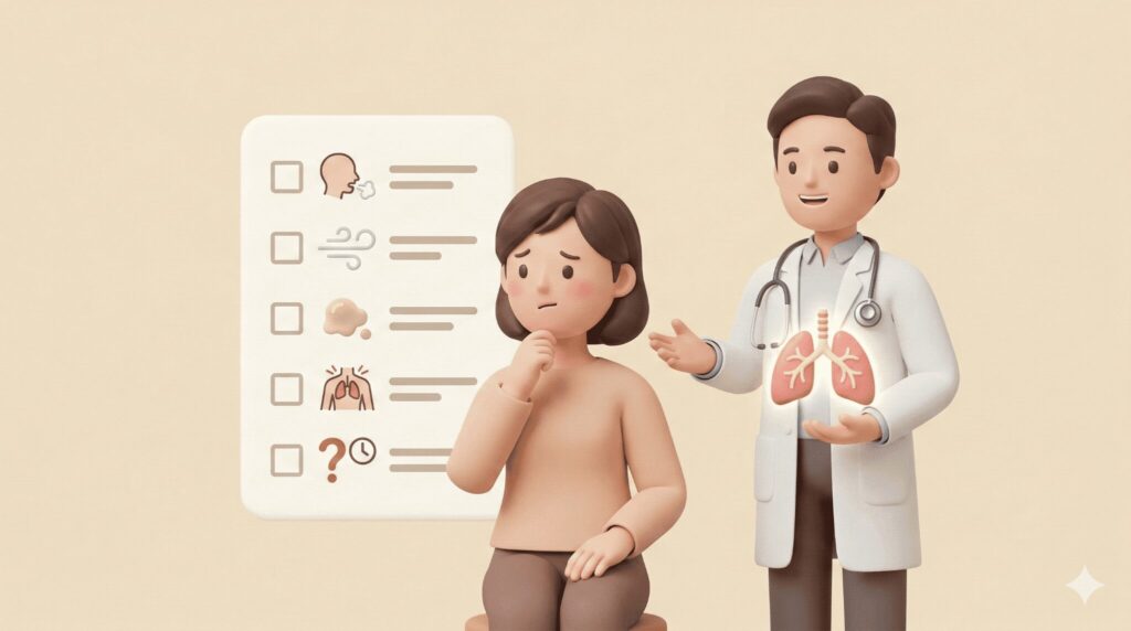 「どのタイミングで受診すればいいの?」と迷っている方は、以下の項目をチェックしてみてください。一つでも当てはまる場合は、呼吸器専門医への相談をおすすめします。