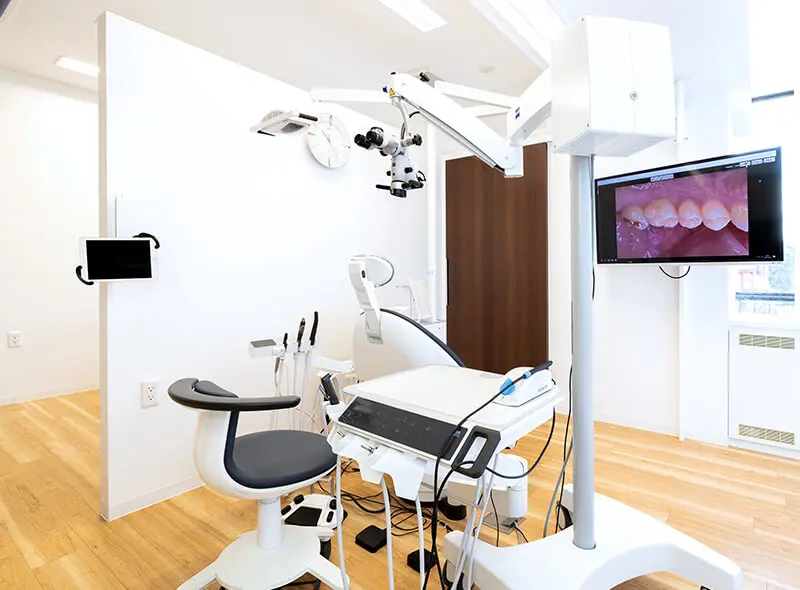 治療はもちろん、歯科衛生士によるメインテナンスや歯磨き指導に至るまで、ほぼ全ての処置でマイクロスコープ(歯科用顕微鏡)を使用しています。これにより、肉眼では見えない歯周ポケット内の歯石や小さなひび割れなどを的確に把握し、精密な処置が可能です。